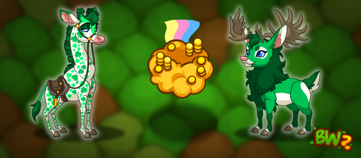 The Gold Rainbow Cloud and Shamrock Giraffe are in packs containing 100 Bush Bucks, 10 Pristine Feed Vouchers, and a VIP Voucher! These two mounts produce their own unique sparkly particles when you ride them!